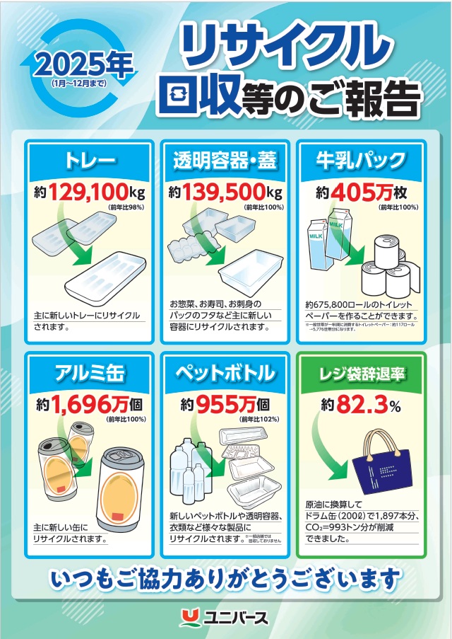 各店舗の店頭にリサイクルボックスを設置し、発泡スチロールトレー、透明容器・フタ、牛乳パック、アルミ缶等の分別回収をしております。